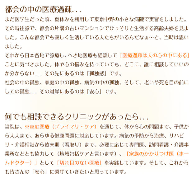 1970年東京生まれ。1997年札幌医科大学医学部を卒業。北海道、九州の臨床研修指定病院等で総合内科、地域医療を学び、当時まだ珍しかった※スーパーローテート研修を受けた後、九州大学病院心療内科に勤務。その後、へき地診療所(島根県隠岐の島)、精神科病院(肥前精神医療センター)を経て、2009年より堀川病院に勤務。2010年より同法人の正親診療所所長を兼務。在宅医療、認知症診療など通して西陣の地域医療に携わる。2014年7月に「たて内科クリニック」を開設。